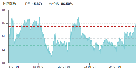 数据显示,截至2025年8月18日,上证指数滚动市盈率(PE-TTM)约15.87倍,处于近十年历史分位数的86.50%。而10年前的2015年8月20日,上证指数滚动市盈率(PE-TTM)约为16.5倍,当年的6月12日,上证指数滚动市盈率(PE-TTM)最高一度达到23倍;4年多前的2021年2月18日,上证指数滚动市盈率(PE-TTM)为16.81倍。
