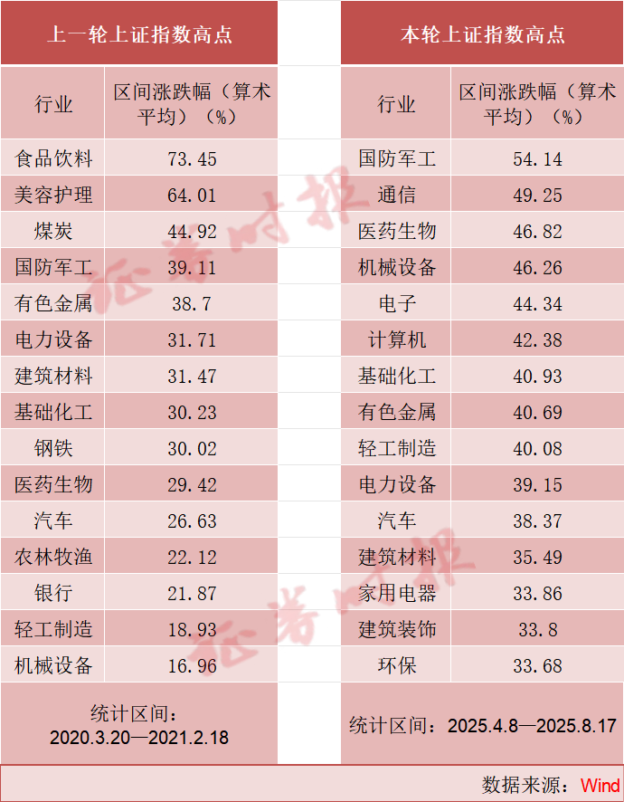 从板块涨幅来看,2025年4月8日以来,截至8月17日,国防军工以54.14%的涨幅领跑;此外,通信、医药生物、机械设备、电子、计算机、基础化工、有色金属、轻工制造等8大行业涨幅均超40%。