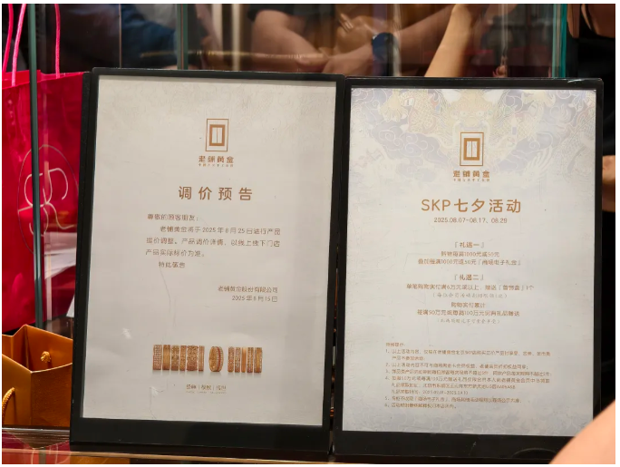 根据老铺黄金公告,自8月25日,将进行产品提价调整。虽然没有公布产品调价详情,但据业内人士推测,涨幅约在10%—15%之间。