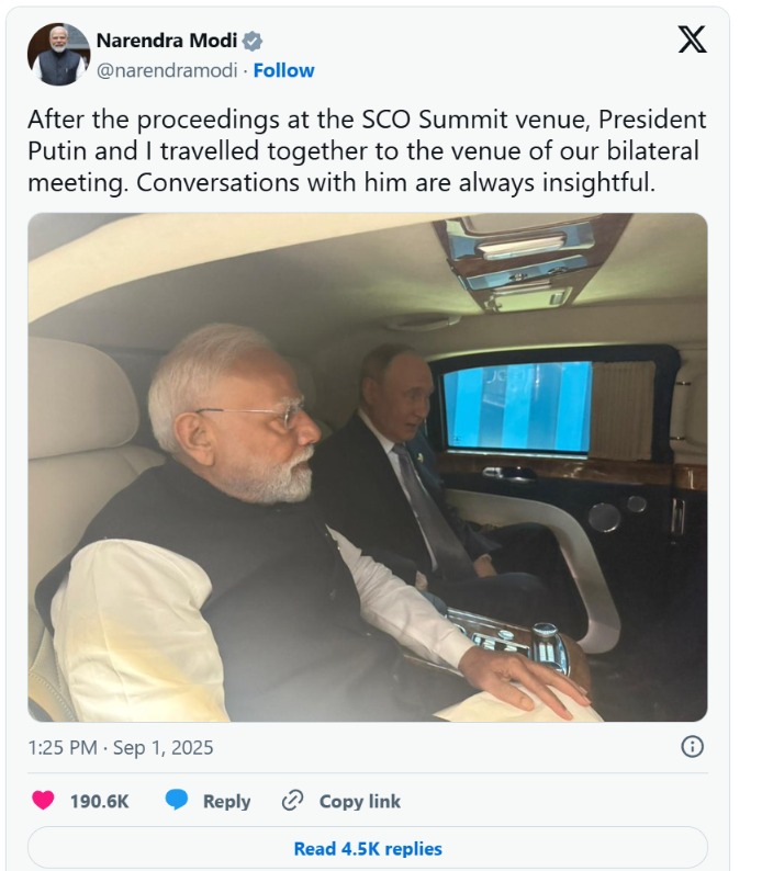 不同寻常的是,莫迪与普京当天乘坐普京的座驾一同前往会场,在车上交谈了大约一个小时。据知情人士透露,这是对原本精心安排日程的一次即兴调整。当天早些时候,两人热情拥抱,莫迪称这次会面“令人愉快”。
