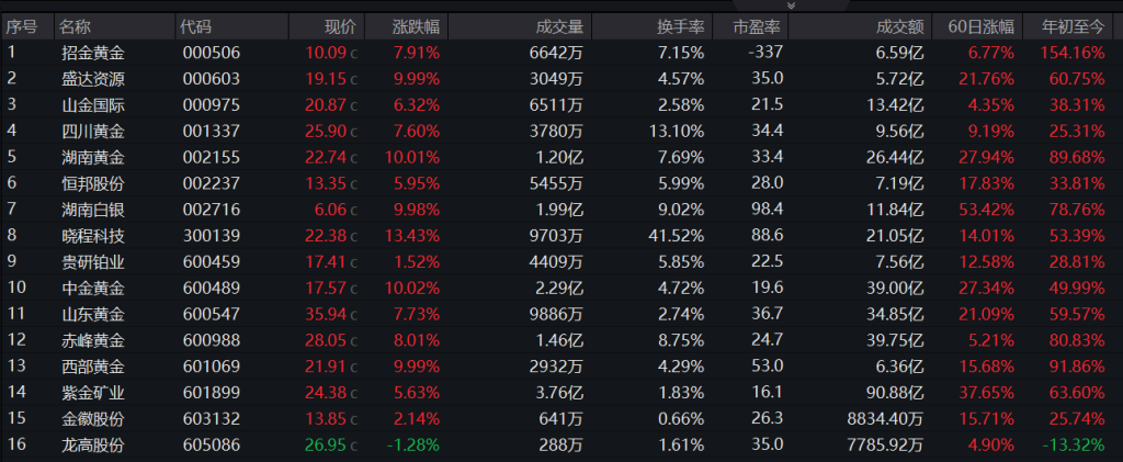 A股贵金属板块大幅领涨,截至9月1日收盘,中金黄金(600489)、湖南黄金(002155)、西部黄金(601069)、湖南白银(002716)等涨停,晓程科技(300139)涨超13%,赤峰黄金(600988)涨超8%,山东黄金(600547)、招金黄金(000506)涨超7%。