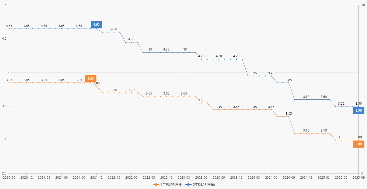 中国人民银行授权全国银行间同业拆借中心公布,2025年9月22日,贷款市场报价利率(LPR)为:1年期LPR为3.00%,5年期以上LPR为3.50%,均较上月保持不变,以上LPR在下一次发布LPR之前有效。