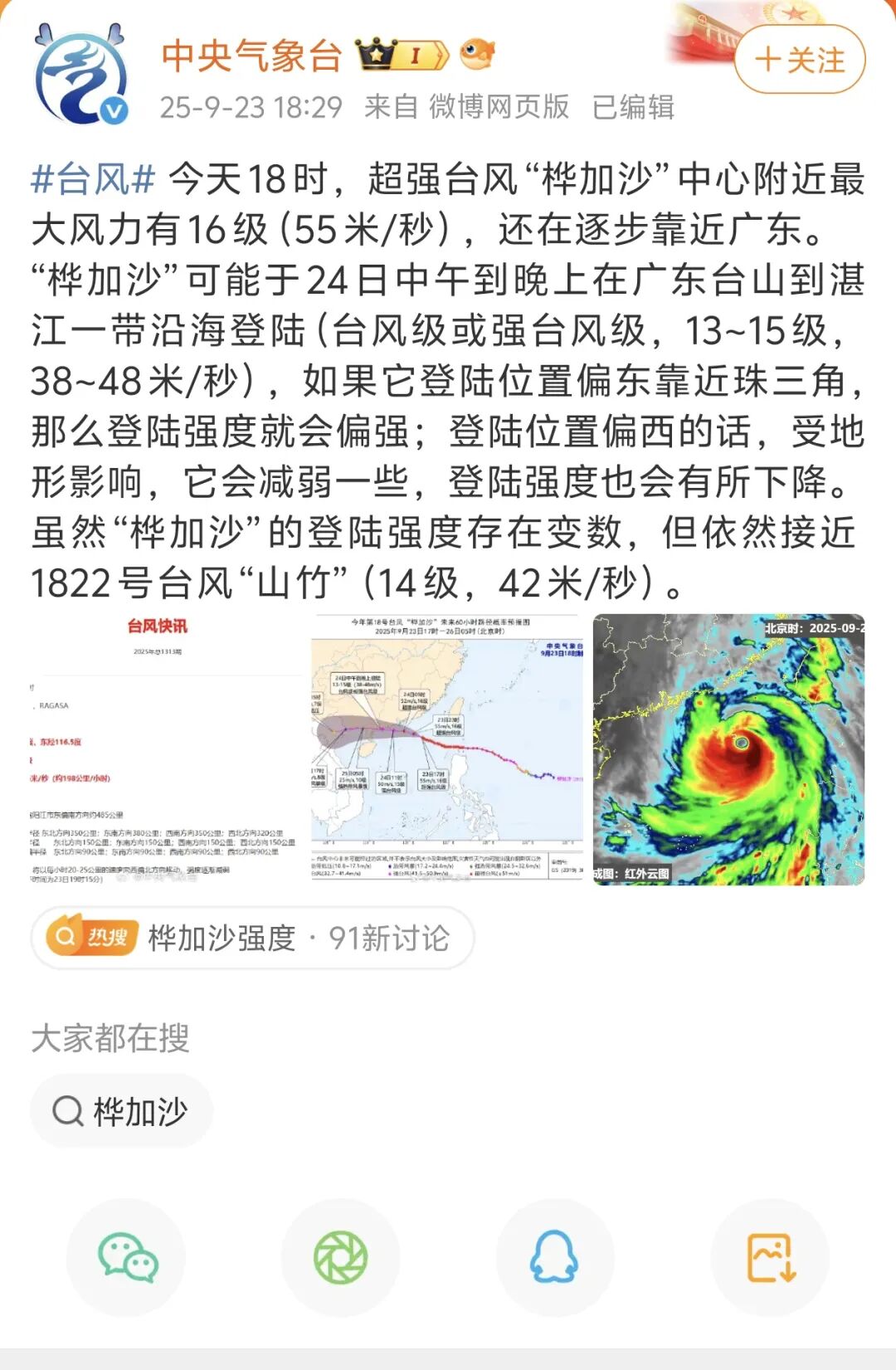 今年第18号台风“桦加沙”正在逼近广东沿海。据中央气象台官方微博9月23日傍晚发布的消息,“桦加沙”可能于9月24日中午到晚上在广东台山到湛江一带沿海登陆(台风级或强台风级,13-15级,38-48米/秒)。