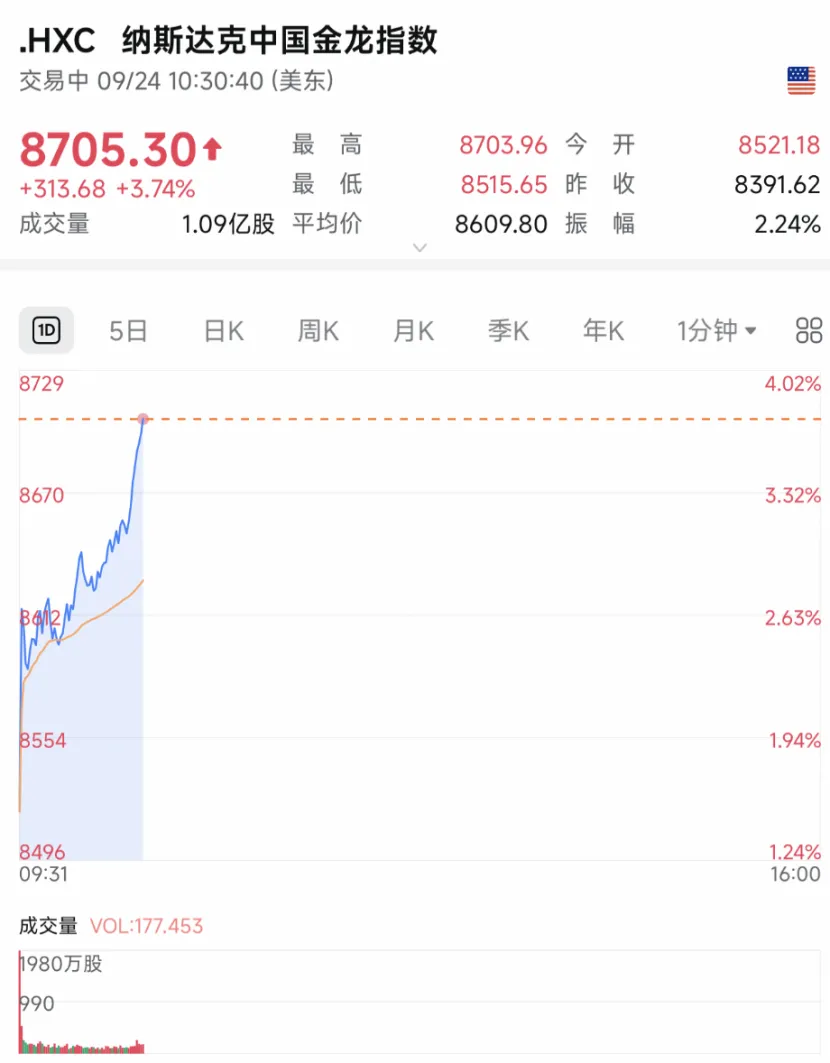 截至收盘,纳斯达克中国金龙指数收涨2.83%,热门中概股普涨。
