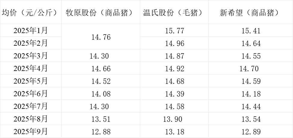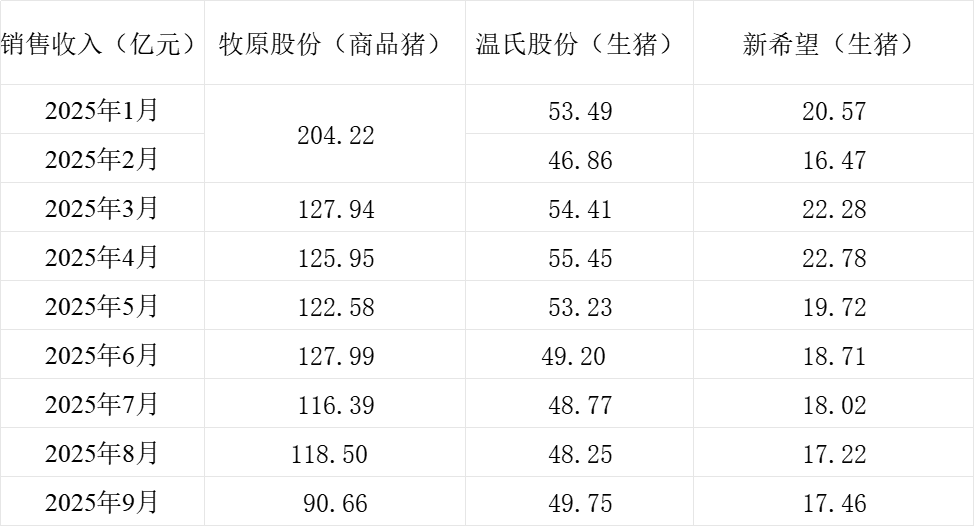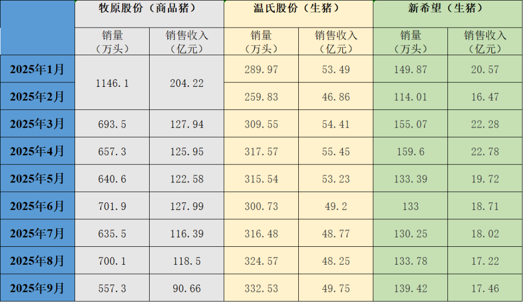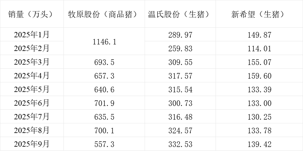 三大上市猪企牧原股份(002714.SZ)、新希望(000876.SZ)、温氏股份(300498.SZ)近日发布2025年9月生猪销售情况。