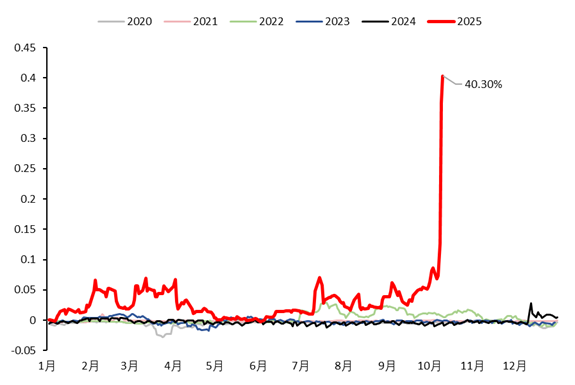截至周五收盘,纽约期银近月合约(指期货交易中距离当前日期最近且即将到期的合约)与伦敦银现的价差达到2.73美元/盎司,为近年来的高位。目前,伦敦白银现货一个月期隐含租赁利率已升至40.3%。