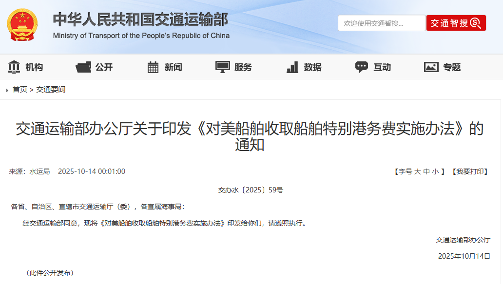 交通运输部办公厅发布关于印发《对美船舶收取船舶特别港务费实施办法》的通知。