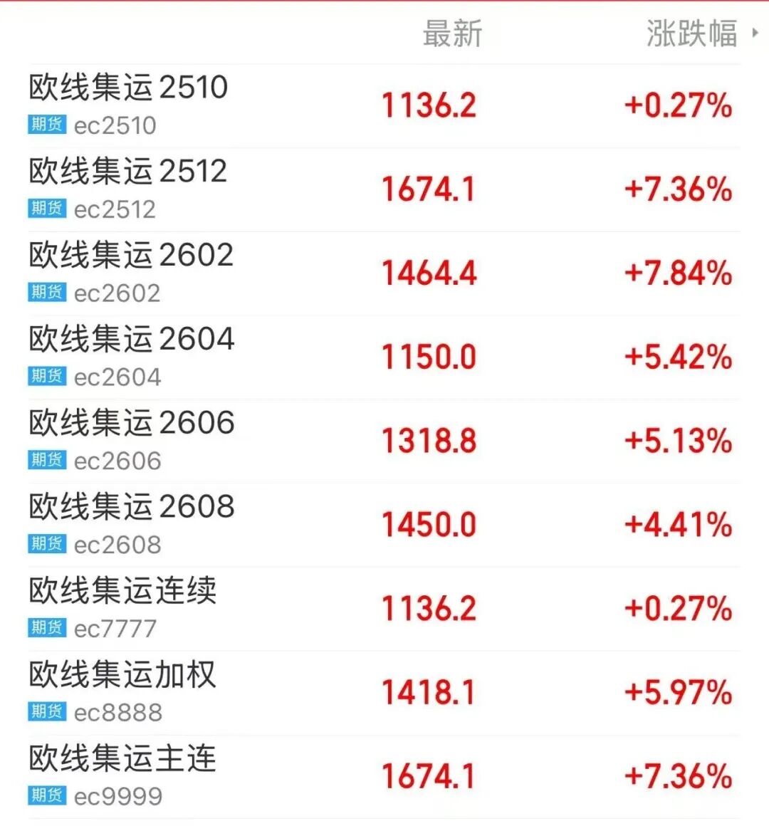 10月14日,集运指数(欧线)期货一改往日颓势,盘中快速拉升,主力2512合约大涨7.36%,收报1674.1点;2602合约大涨7.84%,收报1464.4点;多个远月合约上涨。