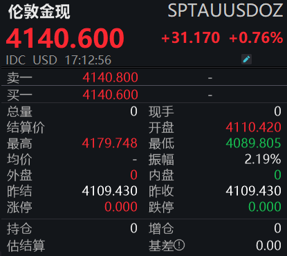 10月14日,国际金价延续上涨趋势,在成功站稳4100美元/盎司上方后,又朝着4200美元/盎司关口稳步推进。截至记者发稿,伦敦金现报4140.6美元/盎司,日内涨0.76%,盘中最高触及4179.748美元/盎司,再创历史新高。