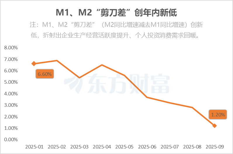 温彬同样提到,M1、M2“剪刀差”收敛,表明更多资金转化为活期存款,有助于消费、投资等经济活动。