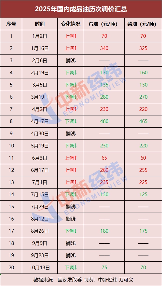 中新经纬注意到,今年以来,国内油价已经历二十轮调价窗口,分别为“六涨八跌六搁浅”。涨跌互抵后,国内汽、柴油价格每吨较去年底分别下调480元、460元。若本轮调价落地,2025年的调价格局将变为“六涨九跌六搁浅”。