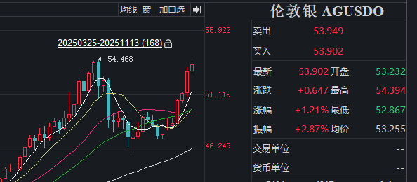 11月13日,国内白银期货强劲上涨,主力合约价格一度达到12639元/千克,创历史新高,收报12588元/千克。伦敦现货白银(下称“伦敦银”)也持续拉升,一度距54.468美元/盎司的历史最高点仅一步之遥。截至发稿,伦敦银有所回落。