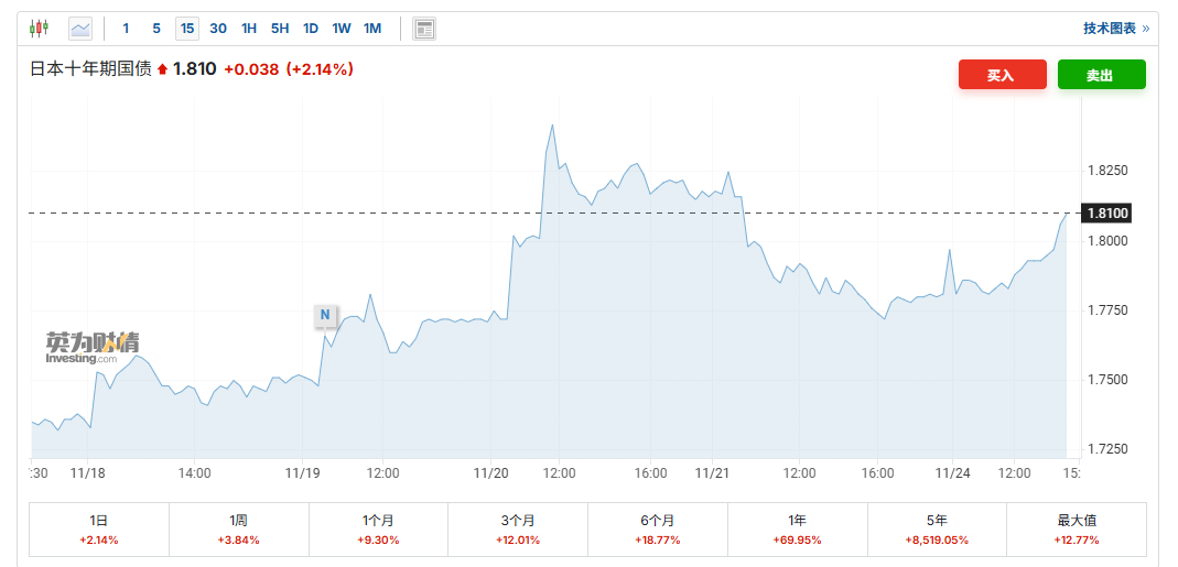 美股的爆发并没有令日本股市出现太大的修复。今天(11月25日),日经225指数一度反弹超1%,但随即转向跳水。而日本十年期国债收益率再度飙升至1.8%上方。
