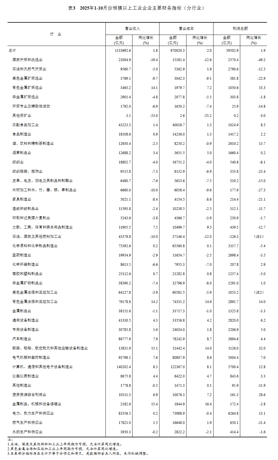 二、规模以上工业企业利润总额、营业收入等指标的增速均按可比口径计算。报告期数据与上年所公布的同指标数据之间有不可比因素,不能直接相比计算增速。其主要原因是:(一)根据统计制度,每年定期对规模以上工业企业调查范围进行调整。每年有部分企业达到规模标准纳入调查范围,也有部分企业因规模变小而退出调查范围,还有新建投产企业、破产、注(吊)销企业等变化。(二)加强统计执法,对统计执法检查中发现的不符合规模以上工业统计要求的企业进行了清理,对相关基数依规进行了修正。(三)加强数据质量管理,剔除跨地区、跨行业重复统计数据。