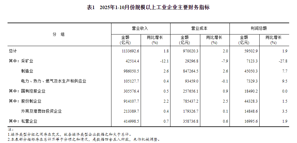 1—10月份,全国规模以上工业企业实现利润总额59502.9亿元,同比增长1.9%(按可比口径计算,详见附注二)。