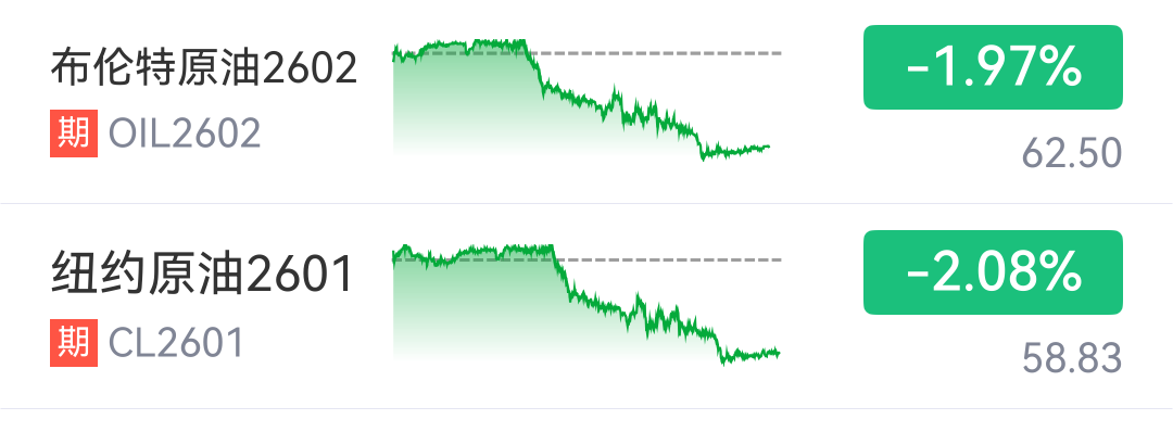 12月8日,国际油价下挫。截至当日收盘,2026年2月交货的布伦特原油期货价格收于62.5美元/桶,跌幅为1.97%;2026年1月交货的WTI原油期货价格收于58.83美元/桶,跌幅为2.08%。