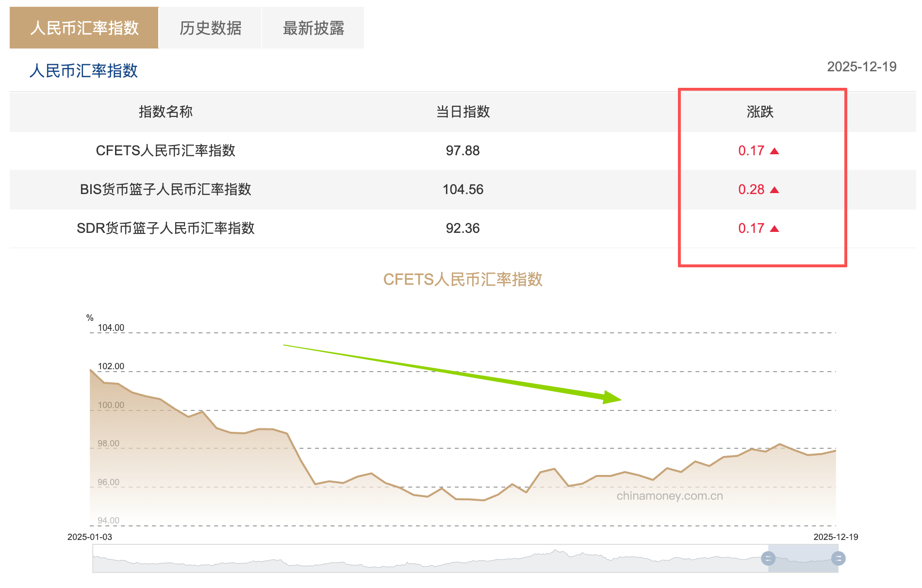 中国外汇交易中心最新数据显示,上周三大人民币汇率指数均环比上涨,但较年初都出现了下跌。12月19日,CFETS人民币汇率指数报97.88,环比上涨0.17,较年初下跌4.1%;BIS货币篮子人民币汇率指数报104.56,环比上涨0.28,较年初下跌3.0%;SDR货币篮子人民币汇率指数报92.36,环比上涨0.17,较年初下跌2.9%。