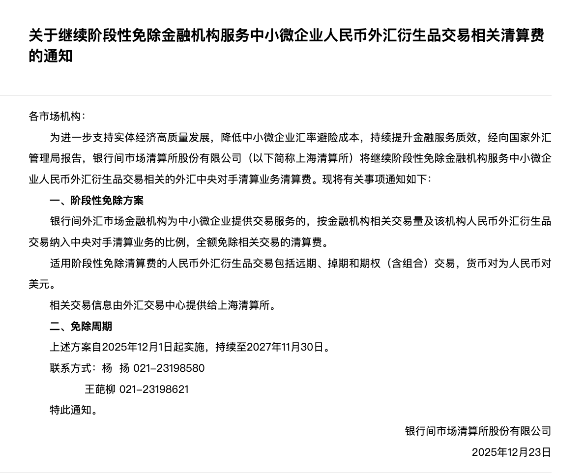 根据公告,银行间外汇市场金融机构为中小微企业提供交易服务的,将按其相关交易量及该机构人民币外汇衍生品交易纳入中央对手清算业务的比例,全额免除相应交易的清算费。阶段性免收清算费的范围包括人民币对美元货币对的远期、掉期和期权(含组合)交易。该方案自2025年12月1日起实施,持续至2027年11月30日。