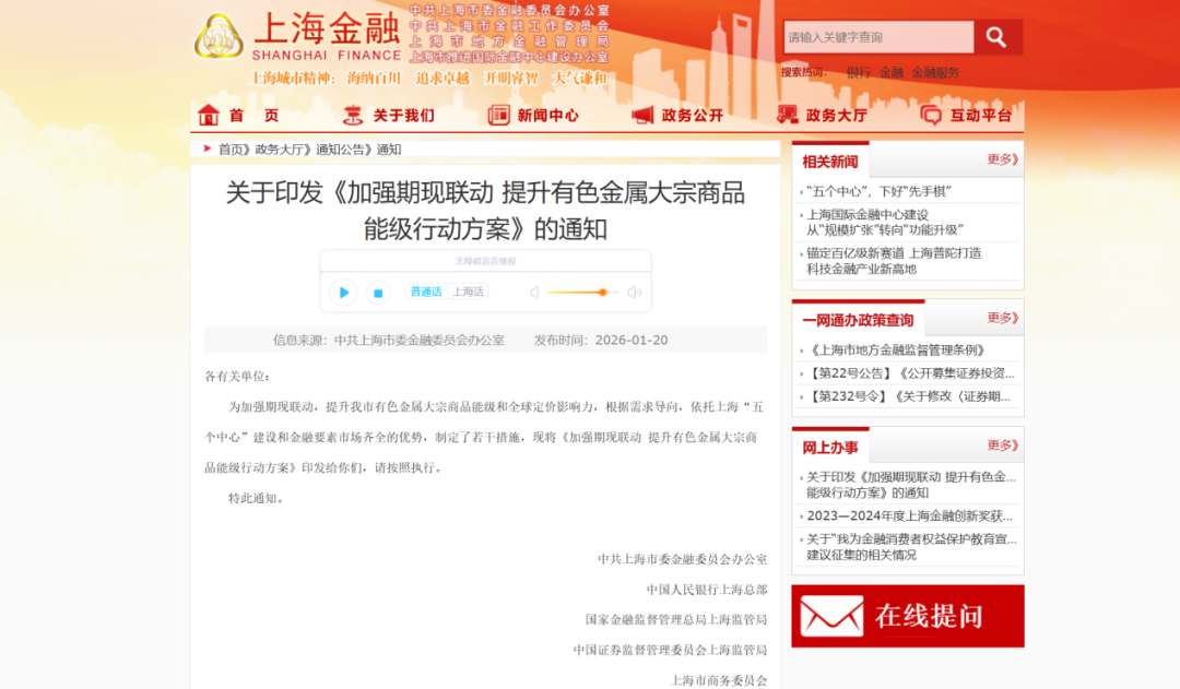 1月20日,中共上海市委金融委员会办公室、中国人民银行上海总部、国家金融监督管理总局上海监管局、中国证券监督管理委员会上海监管局、上海市商务委员会联合发布《加强期现联动提升有色金属大宗商品能级行动方案》(以下简称《行动方案》),提升上海市有色金属大宗商品能级和全球定价影响力。
