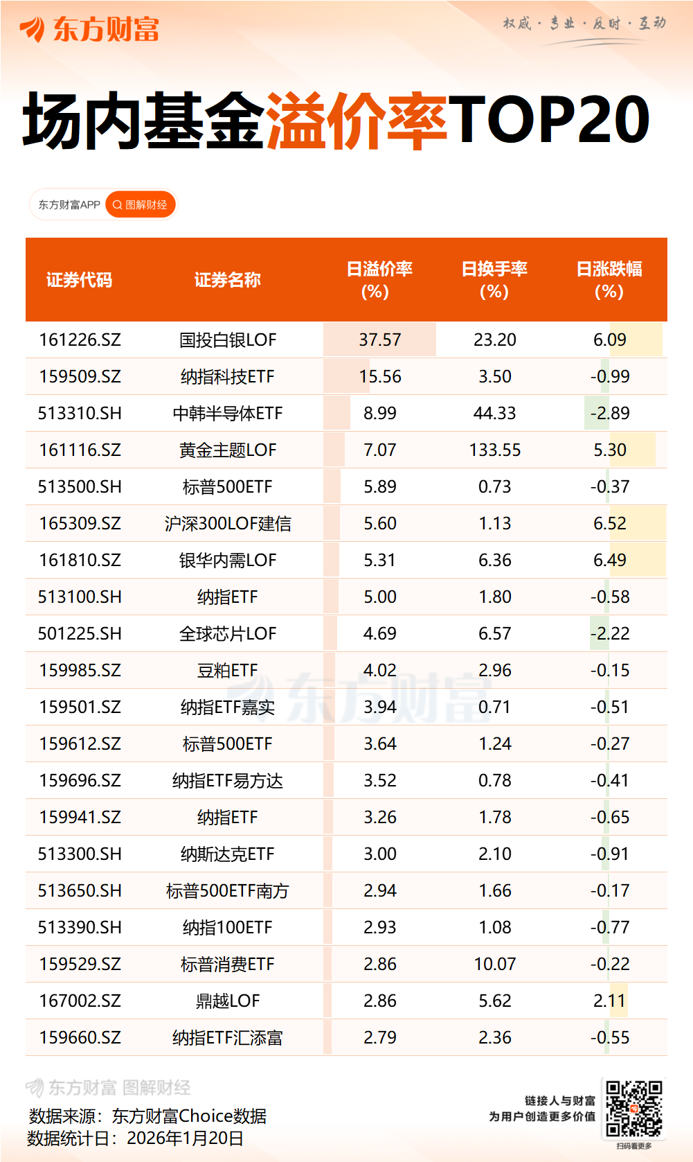 受此影响,国内稀有的白银基金“国投白银LOF”场内价格也水涨船高。1月20日,该基金盘中价格一度创出3.667元的新高,截至当日收盘,年内涨幅约为60%。尽管年内该基金已经因溢价风险发布了9次停牌公告,目前溢价率依然超过30%。