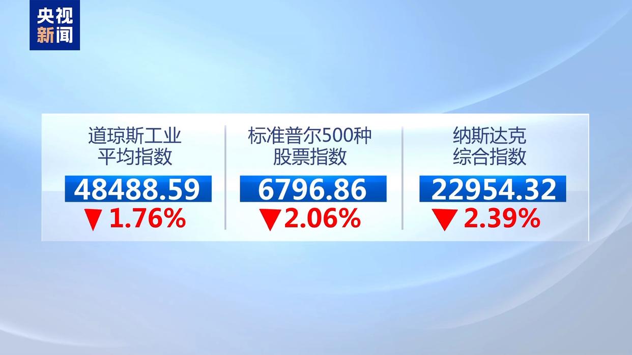 截至20日收盘,道琼斯工业平均指数、标准普尔500种股票指数、纳斯达克综合指数分别下跌1.76%、2.06%和2.39%。