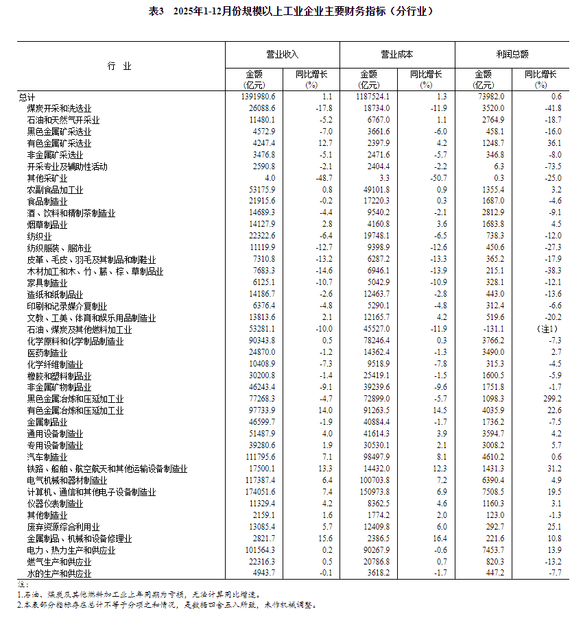 2025年,全国规模以上工业企业实现利润总额73982.0亿元,比上年增长0.6%(按可比口径计算,详见附注二)。